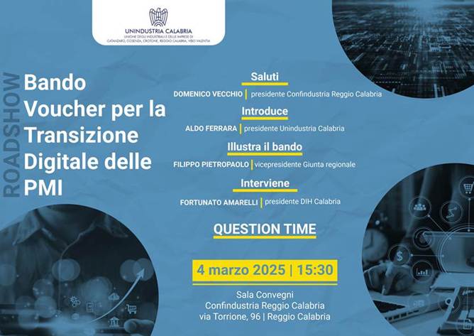 L’incontro si terrà il prossimo 4 marzo alle ore 15.30 presso la sede di Confindustria Reggio Calabria e rappresenta un’opportunità per conoscere nel dettaglio le modalità di accesso ai fondi, i requisiti necessari e le diverse soluzioni digitali che possono contribuire a migliorare l’efficienza e la competitività delle aziende.